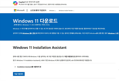 Windows 11 설치 도우미를 다운로드 후 실행하면 기존 데이터를 유지한 채 업그레이드가 가능합니다.